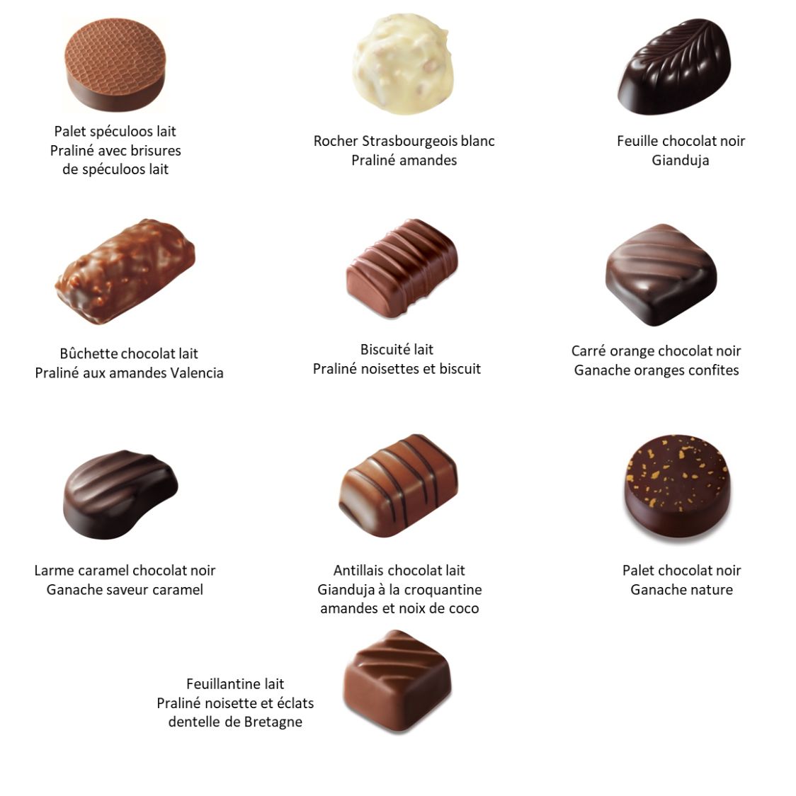Praliné 28,5% (minimum déclaré 28%) (NOISETTES, sucre), sucre 27,3%, beurre de cacao 13,8%, poudre de LAIT entier 12,8%, masse de cacao 6,1%, AMANDES 5,7%, éclats de crêpe croustillante 2,2% (minimum déclaré 2%) (farine de BLE, sucre, beurre concentré (LAIT), sel, LAIT demi-écrémé, LAIT écrémé en poudre, malt d'ORGE), pâte de PISTACHE 1,9% (minimum déclaré 1,5%), beurre pâtissier (LAIT) 0,95%, émulsifiant : lécithines (SOJA) 0,35%, poudre alimentaire colorante 0,24% (concentré de carthame et spiruline), agent d'enrobage (shellac) 0,1%, arômes 0,05%, colorants 0,01% : E100, E141.